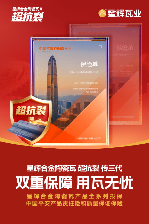 星辉合金陶瓷瓦作为符合国家A类安全标准的优质陶瓷瓦,其安全性已经过权威验证。如今,星辉瓦业合金陶瓷瓦产品全系列正式投保中国平安产品责任险和质量保证保险。选择星辉合金陶瓷瓦,就是选择了一个世代传承、安心无忧的屋面环境。